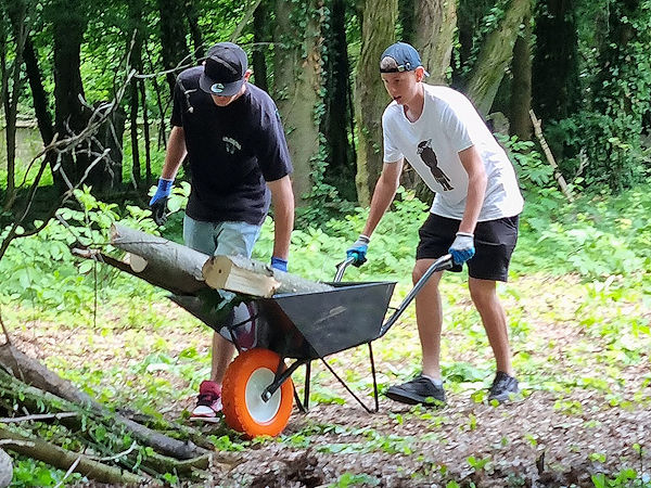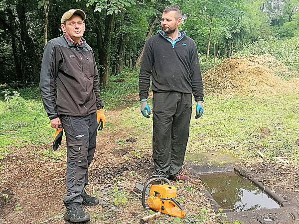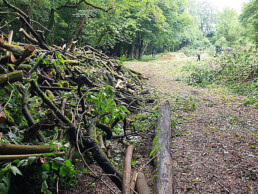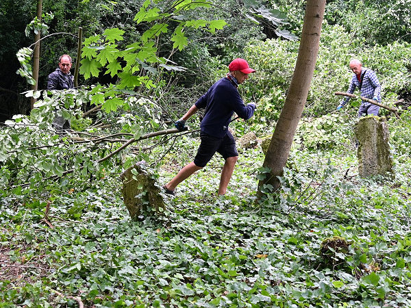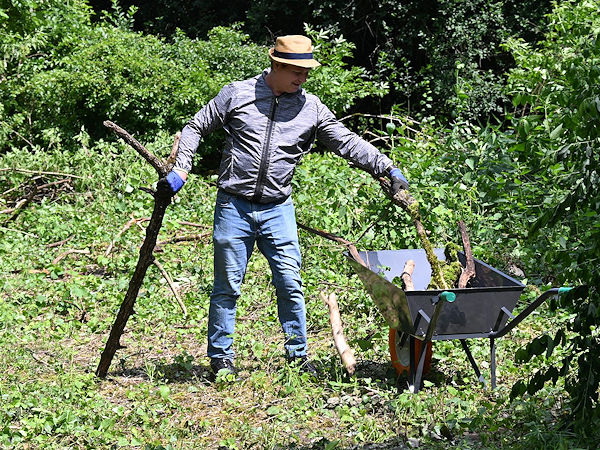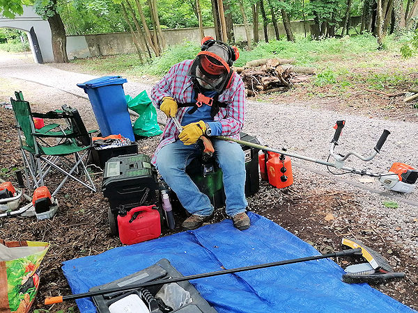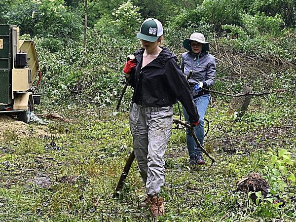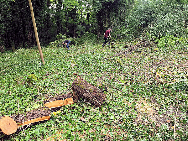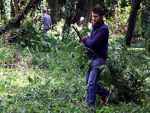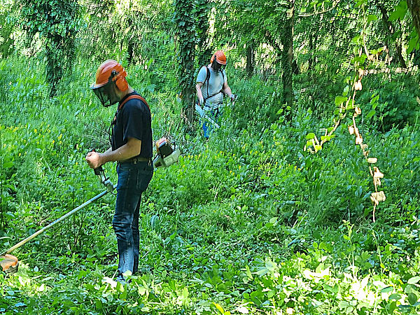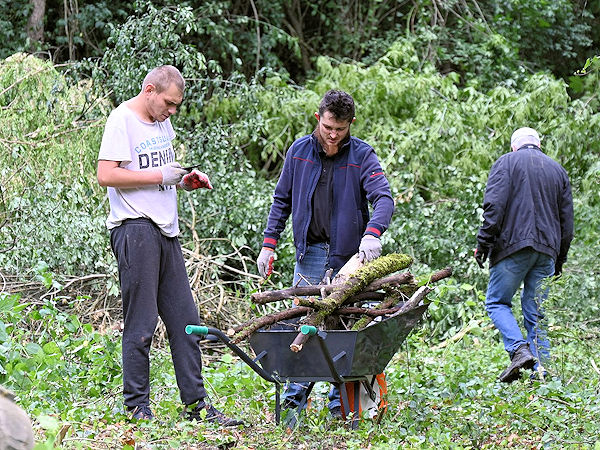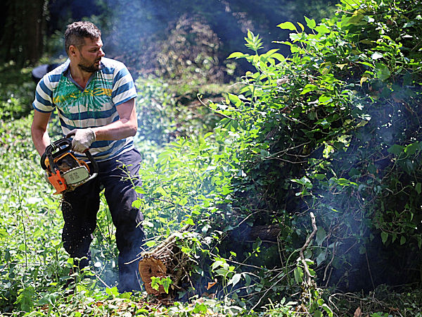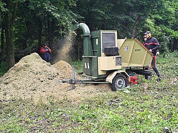 The work focused on removing fallen or overturned tree trunks, which were cut down a few weeks ago by professional loggers, and on moving bushes and branches to the shredder.
