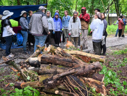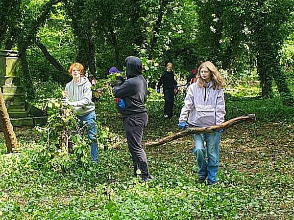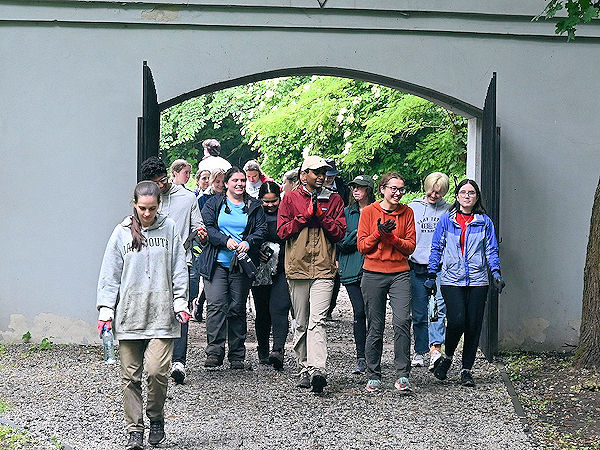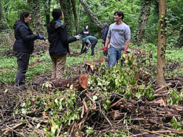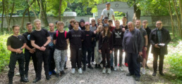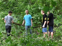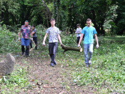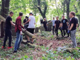After about half an hour of instruction about the cemetery, the Mass Graves and the grave of those murdered in the Kielce pogrom, the students began the cleaning work and, after an hour, cut tree trunks and branches were piled up on the path, waiting to be shredded or removed. In order to maximize the effectiveness of the students’ working time, professional loggers, hired by us, went to work several days before the students arrived and cut down bushes and fallen tree trunks so that the students could focus on removing vegetation from between the rows of graves and bring them to the central pathway.