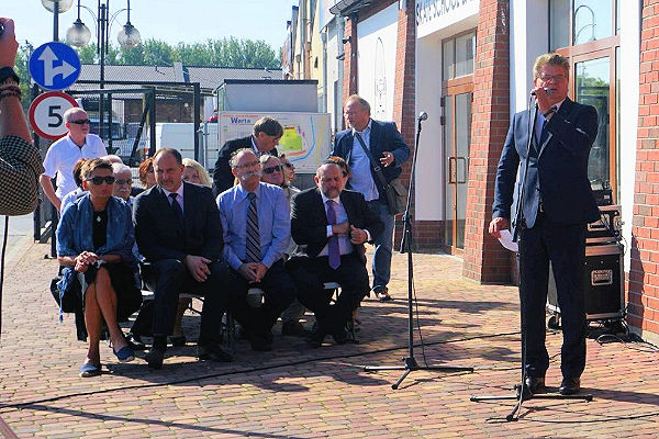 When it was realised that no sign existed which marked the location of the HASAG-Warta camp, where some 4,000 Jewish prisoners had worked from June 1943 to January 1945, we determined to correct that oversight before last week’s visit. The Director of the Częstochowa Regional Museum Tadeusz Piersiak approached Wojciech Kaczmarski, President of the real estate company Polaris, which had redeveloped the site. Mr. Kaczmarski readily agreed to mount a plaque memorialising the victims of Nazi persecution who had suffered and died at this location. Piotr Stasiak and Hana Eliana Gawronska, both of Warsaw, designed the plaque and Ryszard Welgryn, a leader of the Częstochowa Jewish community and the proprietor of ARTMEDAL, executed the design. All was done in record time so that the plaque could be dedicated last week!