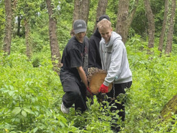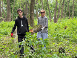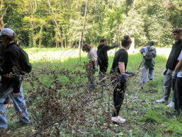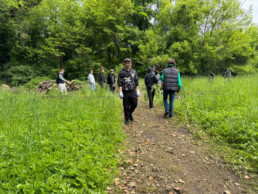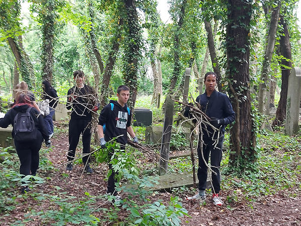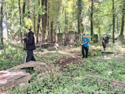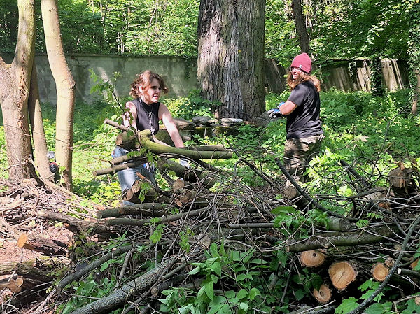 After about half an hour of instruction about the cemetery, the Mass Graves and the grave of those murdered in the Kielce pogrom, the students began the cleaning work and, after an hour, cut tree trunks and branches were piled up on the path, waiting to be shredded or removed. In order to maximize the effectiveness of the students’ working time, professional loggers, hired by us, went to work several days before the students arrived and cut down bushes and fallen tree trunks so that the students could focus on removing vegetation from between the rows of graves and bring them to the central pathway.