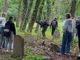 After finding the broken matzevah, covered in vegetation and dirt, Ruth and Gail cleaned it, all the students gathered around the grave and performed a short ceremony.