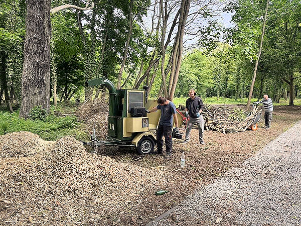 The work focused on removing fallen or overturned tree trunks, which were cut down a few weeks ago by professional loggers, and on moving bushes and branches to the shredder.