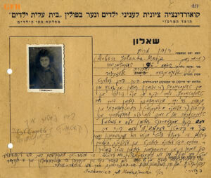 In my search in the archives of the Ghetto Fighters Museum in Israel, I was surprised to find Miriam’s coordination card, written in Yiddish and containing the name of Father Wroblewski, a card filled out by a coordination activist and Miriam’s father, two adult,s who mention the priest as the girl’s saviour.