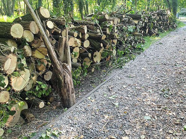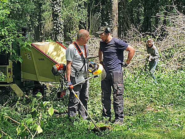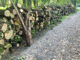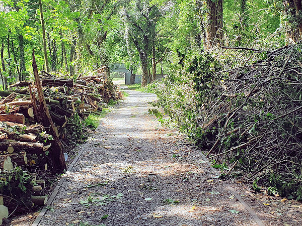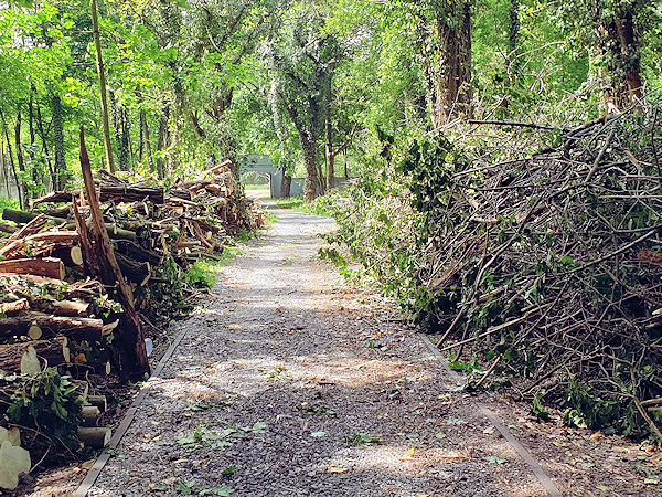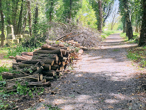 Today’s work focused on moving the logs of the felled trees and bushes, from amongst the graves, to the path in order to enable their removal/shredding. New piles also began to be stacked up in other places along the path. Also, today, the branch-shredding machine began its work. Hiring this piece of machinery provides us with a quick, efficient and cheaper method of removal of vegetation waste from the cemetery.