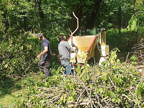 Again the branch-shredding machine was doing its work so that, as previous piles of logs, branches and bushes were shredded, they were replaced with new stacks from today’s work..