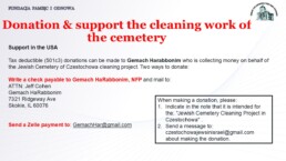 On an almost annual basis, Alon Goldman, Vice-President of the World Society of Częstochowa Jews & Their Descendants and Chairman of the Association of Częstochowa Jews is Israel, has organised and led a clean-up of the Częstochowa Jewish cemetery. Over time, Alon has been joined by volunteers from various organisations, both adults and young people in this holy work.