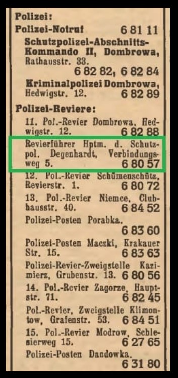 This listing shows that, in 1940, Hauptmann Paul Degenhardt was the Regional Leader of the Schutzpolizei (Schupo) in Dombrowa (today, Dąbrowa Górnicza).
