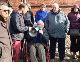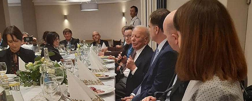 On the following day, the Israeli guides were themselves given a guided tour of many Częstochowa’s Jewish heritage sites including the Ghetto Heroes Square, the HASAG-Pelcery slave labour camp and the Umschlagplatz, from where 40,000 Jews were transported to their deaths in Treblinka. Along the way, the guides heard first-hand testimony our World Society President, Sigmund Rolat. In the evening, dinner was at the Browar. After the dinner, they gathered around Sigmund, who answered guides’ questions and spoke more of his experiences during those days of horror.