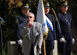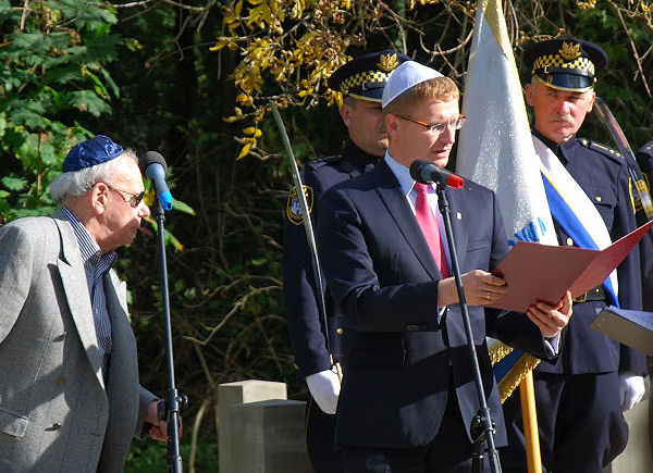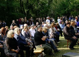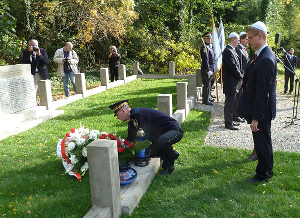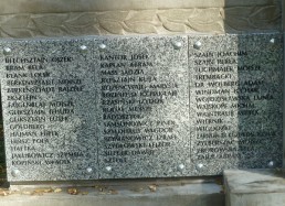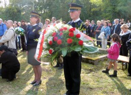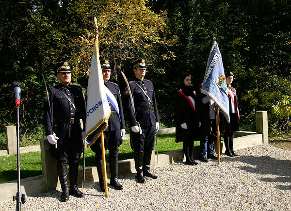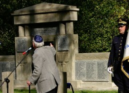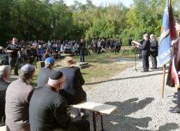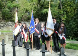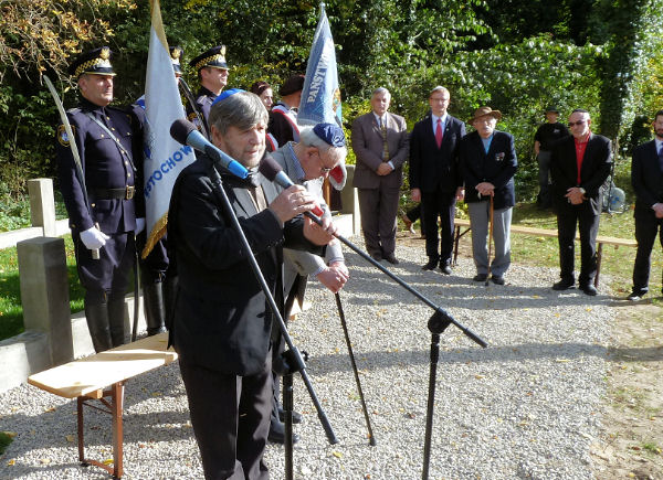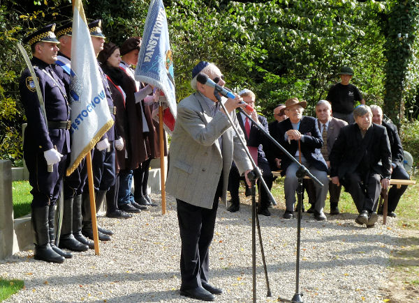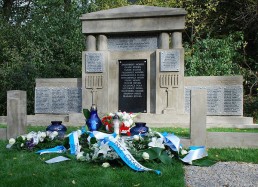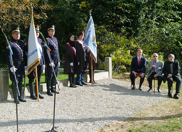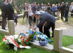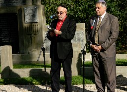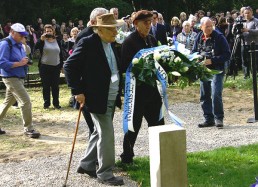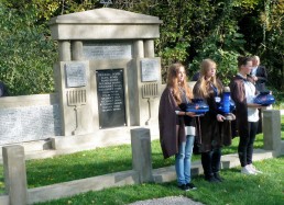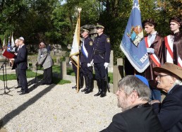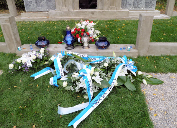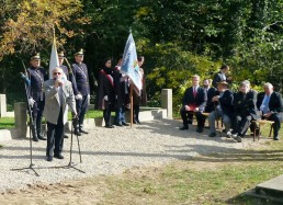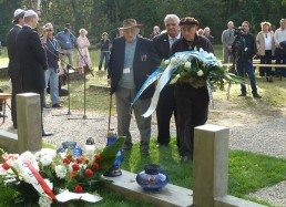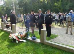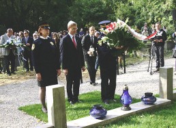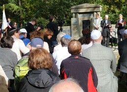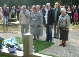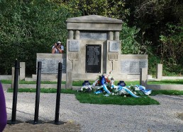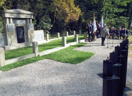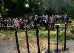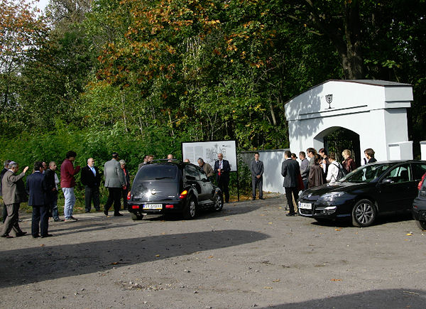 restored cemetery gates, the restored central monument and by the cleared surrounding terrain.